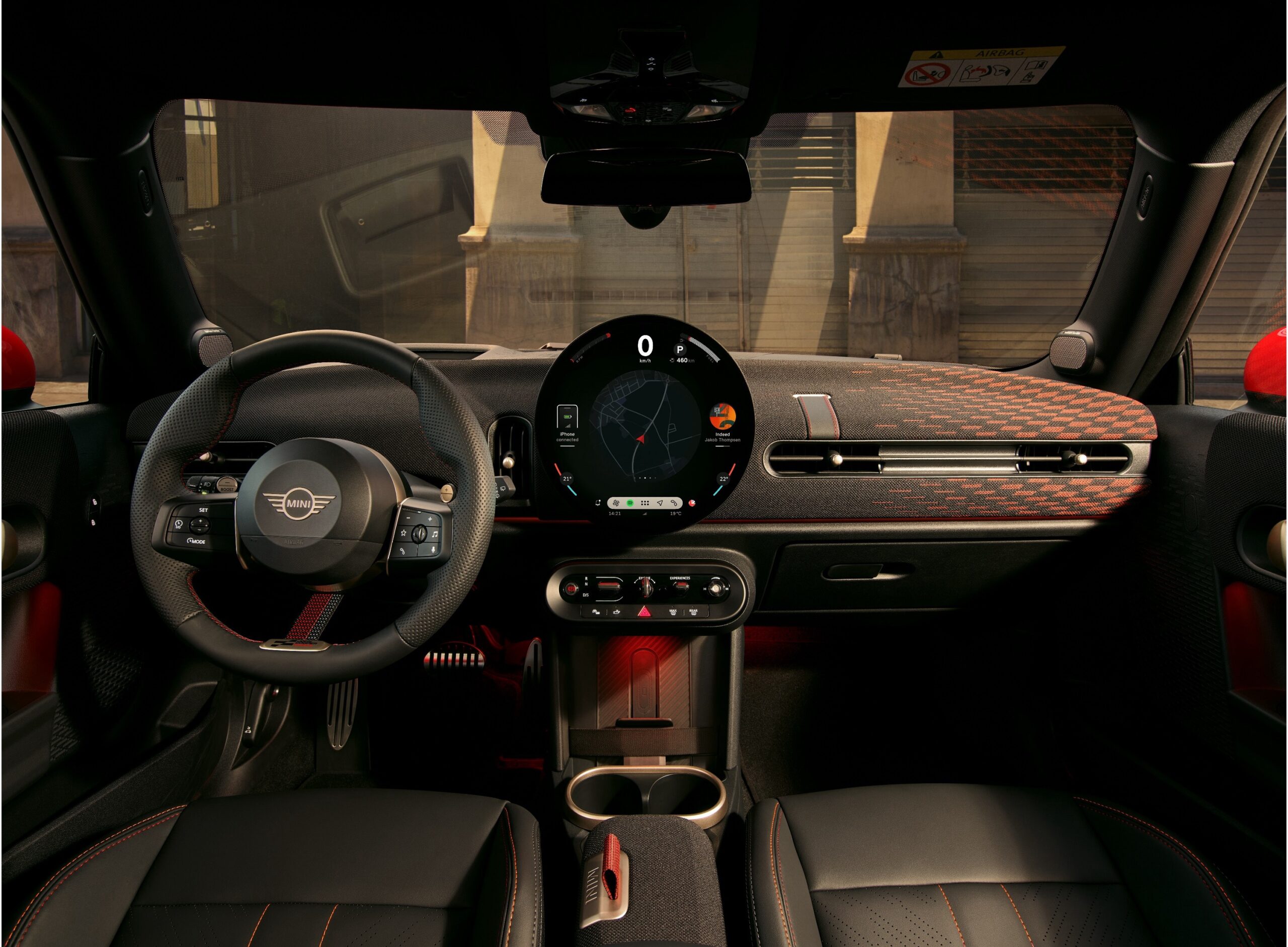 Minimalist design, digital innovations and an immersive user experience are the hallmarks of the interior. The sportiness is elevated with JCW Sports Seats, Vescin/Cord combination JCW Black upholstery and JCW Dashboard Trim. The new JCW Steering Wheel with paddle shifters adds to the hallmark MINI go-kart feeling.