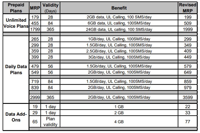 Airtel Revised Tariff (Prepaid )