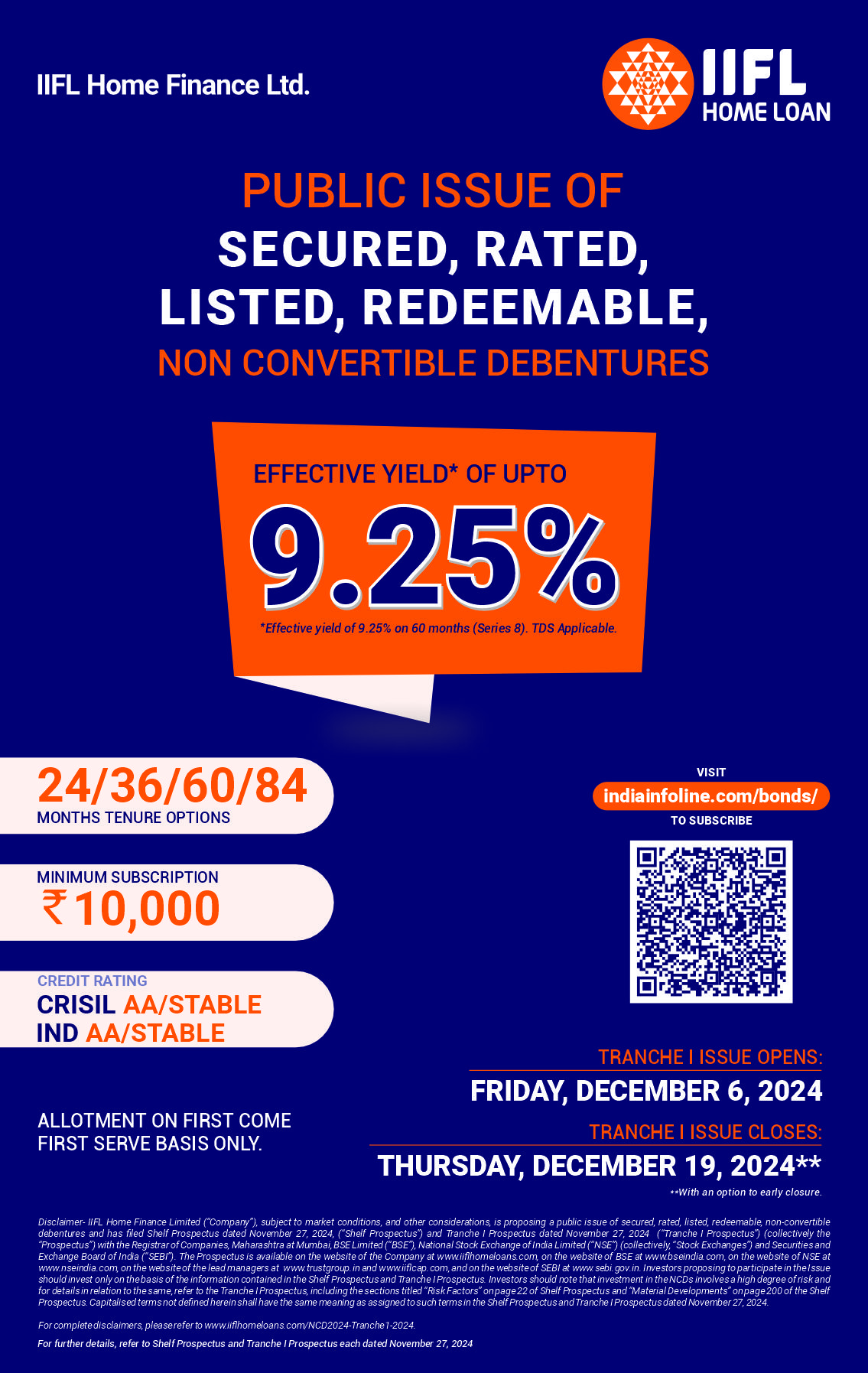 IIFL Home Finance Ltd (“IIFL HFL”) has announced its public issue of secured, rated, listed redeemable non-convertible debentures of the face value of ₹1,000 each (“NCDs”) with a base Issue size of ₹100 crores with an option to retain any oversubscription up to ₹400 crores, aggregating up to ₹500 crores, which is within the shelf limit of ₹ 3000 crore (“Tranche I Issue”). The Tranche I Issue opens on Friday, December 6, 2024 and closes onThursday, December 19, 2024 with an option of early closure in compliance with SEBI NCS Regulations.