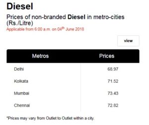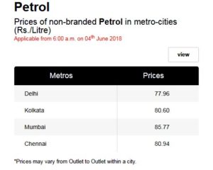 New Delhi : Petrol & Diesel prices have continued to slide for the 6th day. Indian Oil Corporation (IOCL), India’s largest oil marketing company, today cut Petrol prices by 15 paise and Diesel prices by 14 paise. With this reduction Petrol price has come down to Rs.77.96 and Diesel prices to Rs. 68.97 in Delhi. Similarly, Petrol and Diesel prices in Mumbai has come down to Rs.85.77 and Rs.73.43. similarly, in Bhubaneswar Petrol and Diesel prices have come down to Rs.76.77 and Rs. 73.94 respectively.