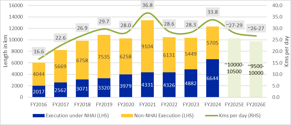 Bhubaneswar : ICRA expects the road execution by the Ministry of Road Transport and Highways (MoRTH) to decline by ~5% in FY2026 to ~9,500-10,000 km from the estimated road construction of ~10,000-10,500 km in FY2025. The same is on account of lower awarding by the Ministry in the past two years (FY2024 and FY2025E). The awarding during 9M FY2025 was subdued at ~3,100 km, which is flattish on a YoY basis but significantly lower than the 5,835 km project awarded during 9M FY2023. ICRA foresees the road awards in the range of 8,500-9,000 km in FY2025, similar to that of FY2024; however, there has been some improvement in project awarding from November 2024, which, if it sustains, should result in ~9-11% growth during FY2026.